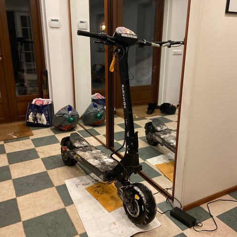 Laudassa on ilmeisesti jousitettu takapää ja mekaaniset levyjarrut. Renkaat ovat leveät ja kuvioidut, mikä soveltuu kaupunki- ja asfalttiajoon. Ohjaustangossa on keskellä varsi, johon voi kiinnittää ohjausyksikön tai näytön (ei näy kuvissa tarkemmin).