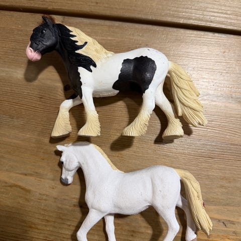 Kaksi schleich hevosta siistissä leikityssä kunnossa. Normaalia leikinjälkeä