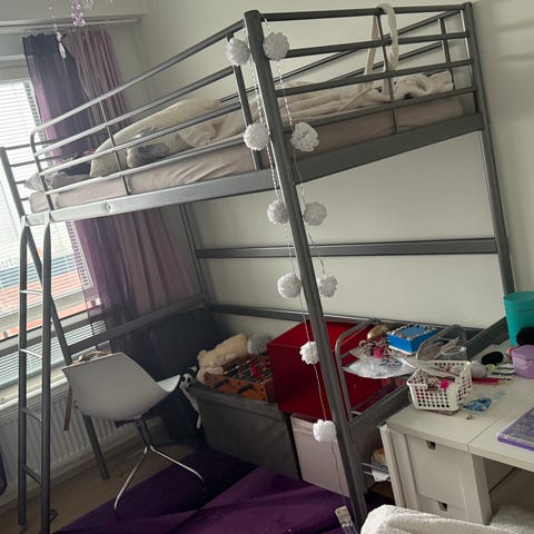 IKEA Svärta parvisänky metallirungolla. Sängyssä on harmaa metallinen runko, suojakaiteet reunoilla ja tikkaat ylös kulkemista varten. Korkea rakenne vapauttaa lattiatilaa sängyn alta esimerkiksi säilytykseen tai työpisteelle. Soveltuu yhden hengen patjalle (ei sisälly).