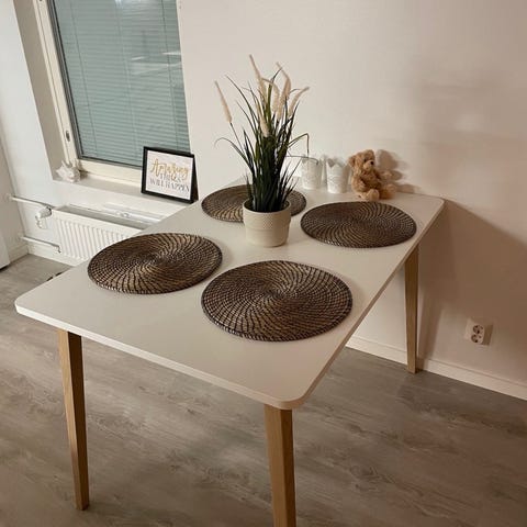 Myydään Jyskin puunvärinen ruokapöytä mustilla metallijaloilla. Mitat 80x120. Nouto Siltasaaresta!