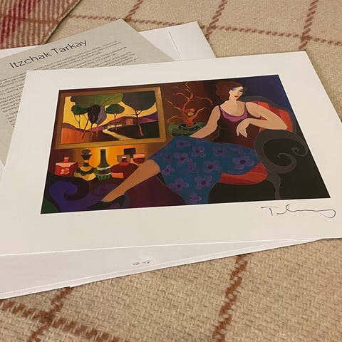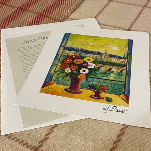 Peter Ellison taidevedos, jossa asetelma kukista ja hedelmistä. Kuvassa on maljakossa olevia kukkia sekä pöydällä hedelmiä. Vedos on painettu paksulle paperille ja siinä on valkoinen reunus kuvan ympärillä. Mukana tulee taiteilijaa ja teosta esittelevä tekstiliite.