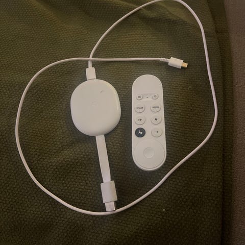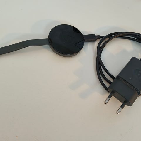 Google Chromecast with Google TV HD on valkoinen mediasuoritin, joka liitetään televisioon HDMI-liitännällä.