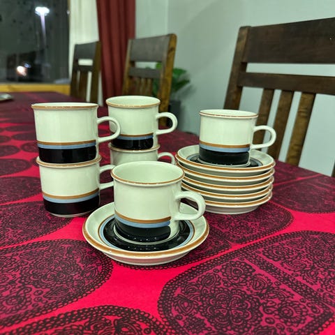 Arabia Taika -sarjan kahvikuppeja ja lautasia. Valkoinen keramiikka, jossa tummat ja ruskeat koristeraidat. Sopii kahvi- tai teehetkiin kattaukseen. Sarjaan kuuluu kuppeja ja niihin kuuluvia aluslautasia, kuten kuvissa näkyy. Materiaali on lasitettu keramiikkaa, astiat ovat pinottavia ja arkeen sopivia. Yksi teekuppi-lautanen-setti maksaa 7 euroa. Löytyy viisi settiä ja yksi lautanen. Koko kasan yhteishinta on yhteensä 30 euroa. Nouto Liedosta ja maksu käteisellä. Voi kulkeutua Turkuun menojeni mukaan. Ei postitusta!