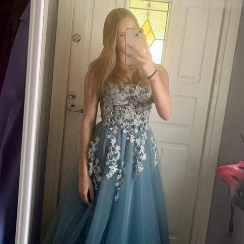 Upea tummansininen röyhelöhelmainen Wanhojen tanssi mekko, vyötärössä timanttinauha 💙✨️💎