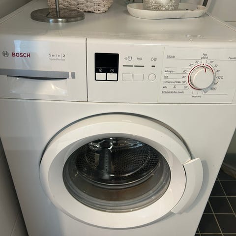 Laitteessa on myös linkous- ja huuhteluohjelmat. Pesuainelokero pääpesulle ja huuhteluaineelle, tahranpoistoaine laitetaan rumpuun ja klikataan esipesu-painike päälle.
