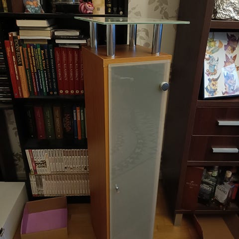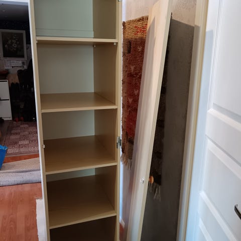 Kylpyhuoneen kaappi, johon lisätty kaksi säädettävää jalkaa. Seinäkiinnitysmahdollisuus. Ovi irroitettu kuljetusta varten. Vain nouto ja omat kantajat mukaan.