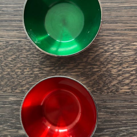 Tinasta valmistetut norjalaiset Konge tinn merkkiset salaattiottimet. Viikinkiaiheisia kuvia ja kirjoitusta