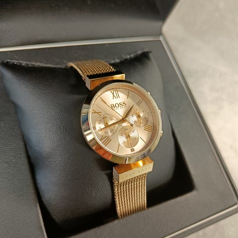 Hugo Boss naisten rannekello metallisella teräsrannekkeella. Kellossa on pyöreä vaalea kellotaulu, jossa roomalaiset numerot ja useita pienempiä apunäyttöjä. Kuori on metallinvärinen, ja ranneke on hienolenkkeinen mesh-tyyppinen teräsranneke.