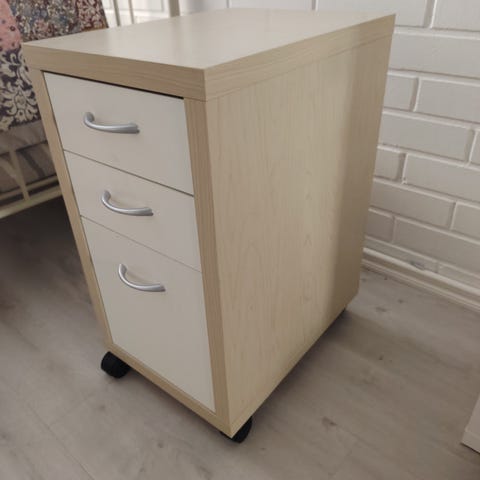 Kohtalaisen siistissä kunnossa oleva laatikosto pyörillä. Kaikki laatikot toimii moitteettomasti. Kannessa vähän jälkiä mutta muuten siisti.
