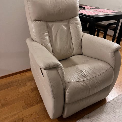 Suomalaisen PeeM Oy:n valmistama nahkainen nojatuoli 60-70-luvulta. Edellisen omistajan kissan kynnenjäljet käsinojissa, muuten nahka hyvässä kunnossa. Istumakorkeus 40 cm. Jalat petsattua pyökkiä, irtotyynyt ja jousitettu istuin. Painava tuoli. Nouto Muurlasta.