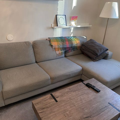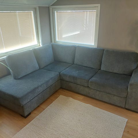 Fuksia divaani , sileällä sametin tuntuisella tekstiilillä verhoiltu. Napakka istua .ei upottava mutta tyynyillä ja peitolla päikkärit taattu.