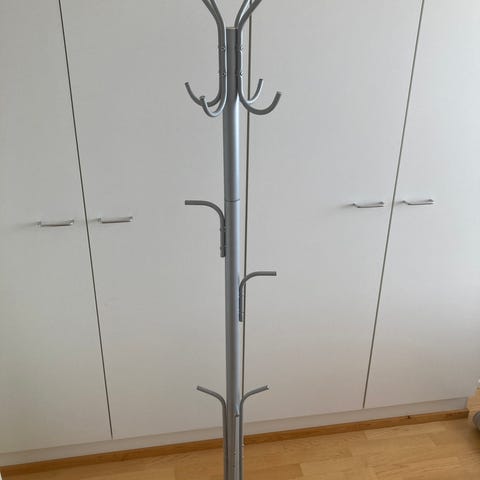 Naulakko, jossa on useita koukkuja ja pyöreä jalusta. Harmaa runko ja puunväriset yksityiskohdat koukuissa.