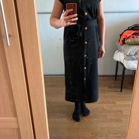 Hyväkuntoinen musta Aarre-merkin tunika/mekko, jossa on taskut. Mitat noin: kainalosta kainaloon 53 cm, pituus noin 88 cm.