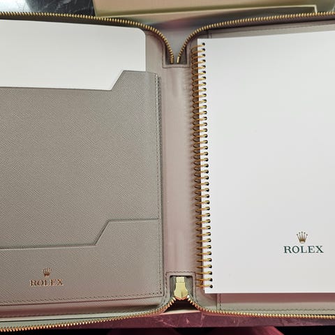 Uusi tyylikäs Rolex muistikirjasetti: muistiinpanolehtiö + kuulakärkikynä ruskeilla tekonahkakansilla, jossa 2 taskua tärkeille asiakirjoille. Alkuperäisessä Rolex laatikossaan.
