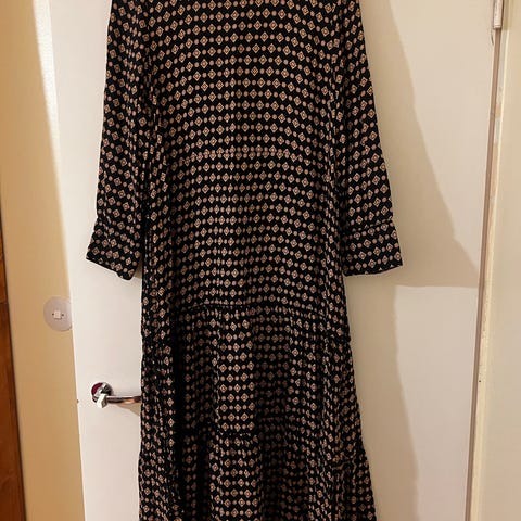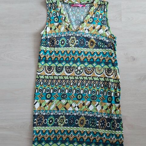 Mekossa on hihaton malli ja monivärinen, kuvioitu kangas, jossa on vihreitä ja tummansinisiä kuvioita sekä vaaleanpunaisia raitoja.