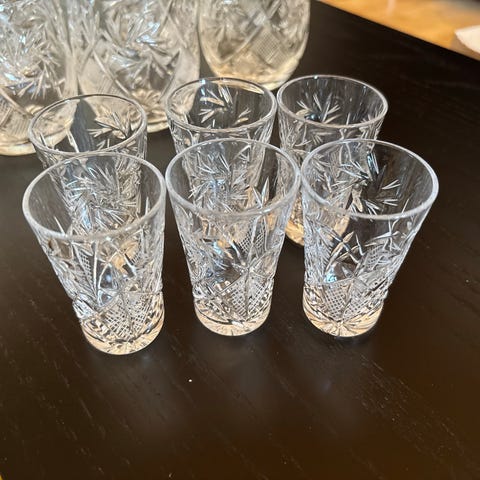 Jalalliset snapsilasit, yhteensä 7 kpl. Kirkasta lasia, sylinterinmuotoinen kuppi ja paksu jalallinen pohja. Sopii esimerkiksi juomille, kuten mehu- tai snapsilaseiksi. Myydään settinä kuvien mukaisesti. Kork. 10 cm, halk 6 cm
