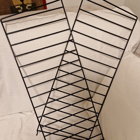 Musta string hylly. Muuten hyvässä kunnossa, mutta joitain pieniä kolhuja saattaa olla. Isoin jälki (näkyy kuvassa), yhden hyllyn pinnassa. Kulkeutuu Turkuun omien menojen mukaan