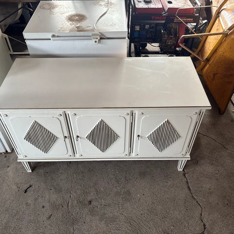 Siistikuntoinen, tummanvihreäksi maalattu lipasto jossa tummanruskeat keinonahkaiset rivat.