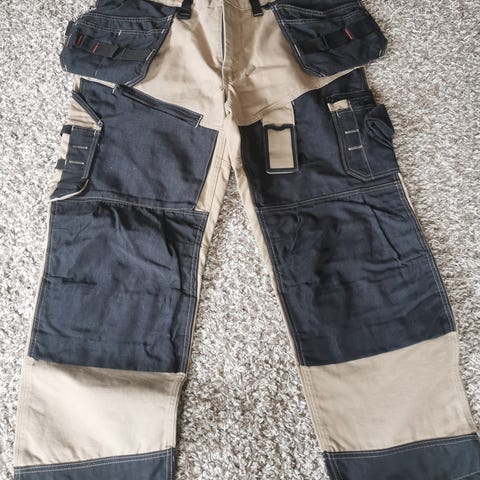 Hobby työ- ja ulkoiluhousut, koko 38. Housuissa vihreä perusväri ja mustat vahvikkeet polvissa ja takamuksessa. Vyötäröllä kuminauha istuvuuden säätöön. Useita vetoketjullisia taskuja pientarvikkeiden säilytykseen. Soveltuvat esimerkiksi ulko- ja pihatöihin tai muuhun vapaa-ajan käyttöön.