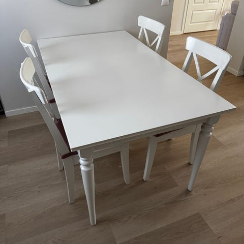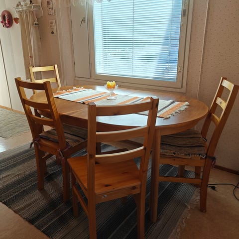4 hengen ruokailu ryhmä, pöytä jatkettavaa mallia. Ostettu uutena 2vuotta sitten.Hinnat silloin tuolit 56e kpl ja pöytä 199e. 50e /tarjous, nopeat kaupat mielellään. Tuolien kunnossa ei pitäisi olla sanottavaa.