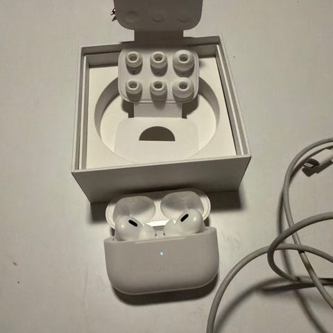 Apple AirPods Pro langattomat nappikuulokkeet valkoisena. Korviin asetettavat in-ear-kuulokkeet, joissa silikonitulpat. Mukana latauskotelo ja latausjohto. Sopivat yhteensopiviin Apple-laitteisiin ja muihin Bluetoothia tukeviin laitteisiin langatonta kuuntelua ja puheluita varten.