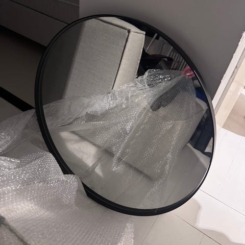 Clash Ohlssonilta (muistaakseni) muutama vuosi sitten uutena hankittu peili. Peilissä on mustaksi maalattu metallikehys, jonka halkaisija on 75 cm. Peilin takana on seinäkiinnike ja kaksi kiinnityskohtaa. Peili painaa 5 kiloa.