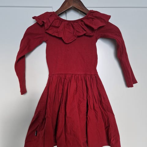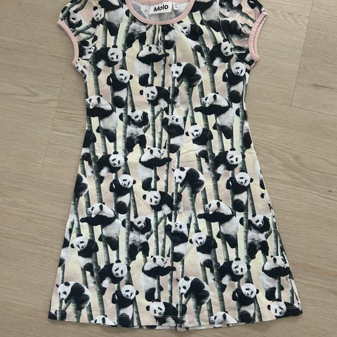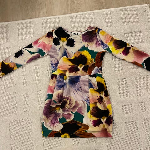 Kaunis kukka ja kolibrikuvioinen Molon trikoomekko koossa 110/116. Ihanan mallinen kellohame. Säilytyksestä ryppyinen.