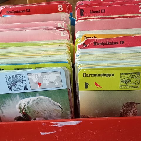 Erilaisia hirviökortteja ja laminoidut ryhmien nimikortit.