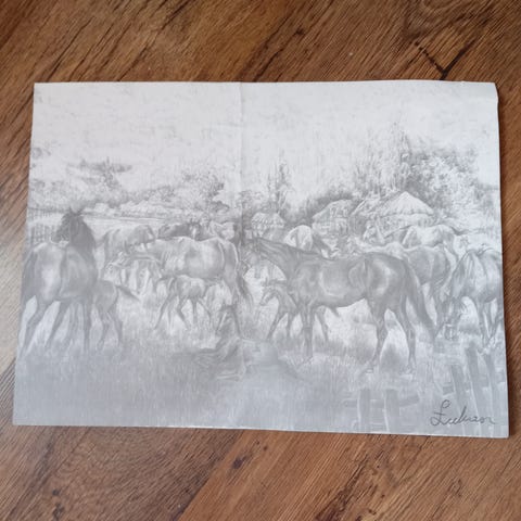 Hevosaiheinen piirustus. Säilytyksessä hieman rypistynyt. K 40cm L 29cm.