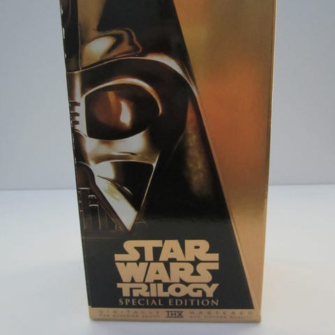 Star Wars Trilogy Special Edition VHS-elokuvat boksi. Pakkaus sisältää kolme Star Wars -elokuvaa: Star Wars, The Empire Strikes Back ja Return of the Jedi. Elokuvat ovat VHS-kaseteilla ja ne on koottu yhteiseen koteloon, jossa on erilliset kotelot jokaiselle kasetille.