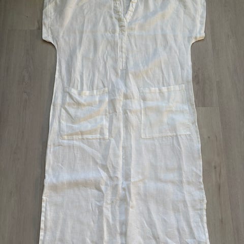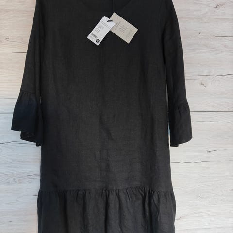 Nanso pellavamekko, koko 42. Vihreä naisten mekko, 100 % pellavaa. Kaulus ja nappikiinnitys edessä, pitkät hihat ja rintatasku. Vain kerran päällä ollut ja pesty pellavapaita.