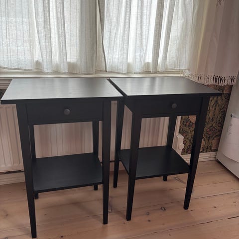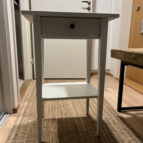 Ikea Hemnes yöpöytä/sivupöytä, valkoinen. Pöytä tason maalissa kulumaa, jonka voi halutessaan maalata tai hioa. Maalin alla vaalea puupinta. Laatikko hyvässä kunnossa. Ovh 79,90 euroa.