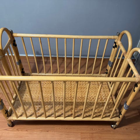 Kätevä kokoontaitettava pinnasänky pyörillä. Koko 120x60, kokoontaitettuna 14cm leveä. Korkeus 77cm. Pyörissä lukitus. Mukana Ikean Krummelur-patja ja Len-laitapehmuste.