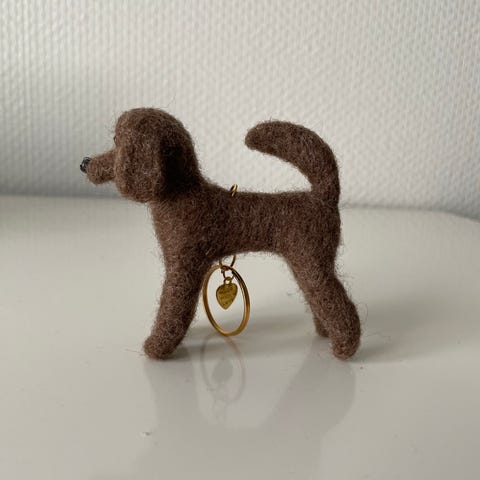 Huovutettu laukkukoru/avaimenperä. Musta koira ja hopea avaimenperäketju.