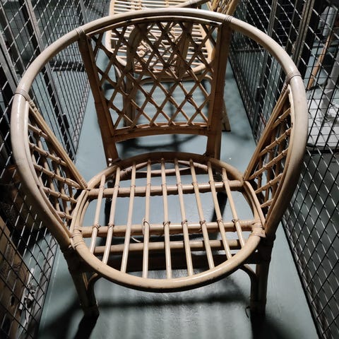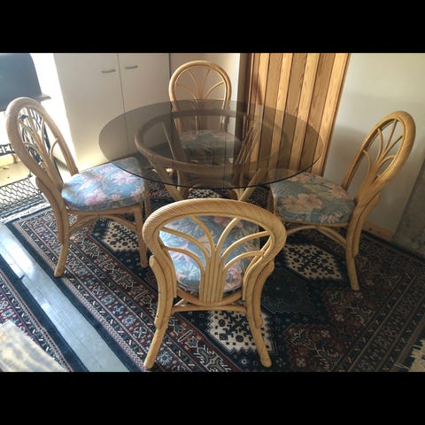 Hyväkuntoinen, Siisti rottinkikalusto pehmusteineen, 2 tukevaa tuolia+ lasikantinen pöytä. Muuton alta pois.