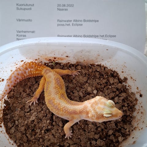 Kaikinpuolin terve, syö hyvin, luo nahan hyvin jne. Tykkää isoista jauhomadoista ja sirkoista.