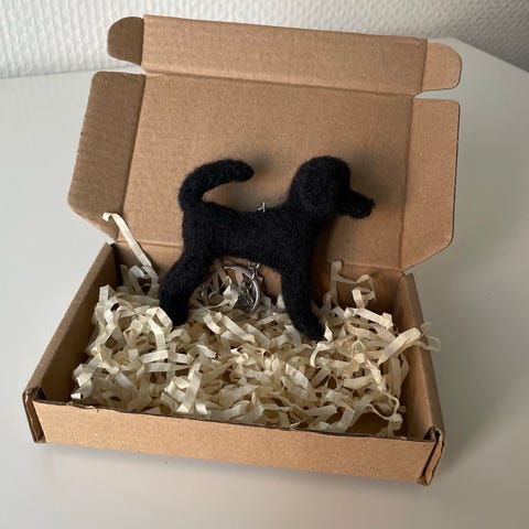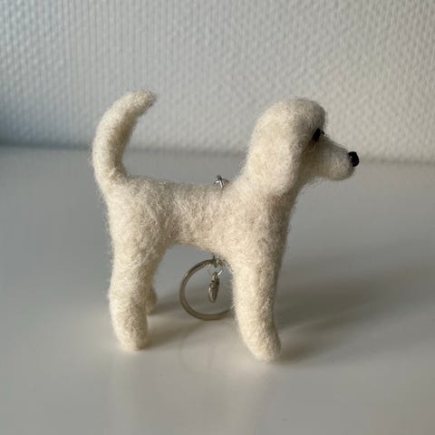 Huovutettu laukkukoru/avaimenperä. Ruskea koira, ja kultainen avaimenperäriipus.