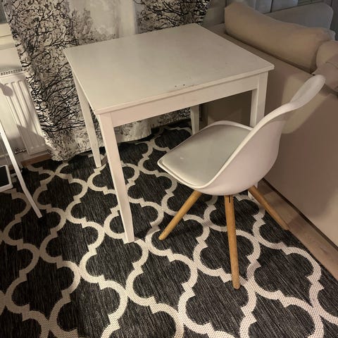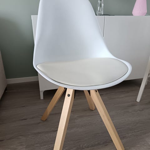 2 valkoista ruokapöydän tuolia, kangaspehmuste
