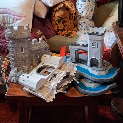 Reilut 10 vuotta sitten ostettu,äänet ei ilmeisesti enää toimi ja toiselta puolen alhaalta katkennut osa mihin tulisi linnan toinen sivuosa kiinni.ylhäältä saa sen laitettua ja aika hyvin pysyy paikoillaan liikuteltaessa. Muuten hyväkuntoinen.