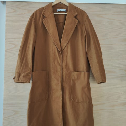 Naisten pitkä takki, koko 38. Väri ruskea. Takissa on kauluskäänteet ja napitus edessä. Sopii käytettäväksi arjessa ja siistimpänä päällystakkina viileämpiin säihin. Ostettu Yhdysvalloista merkki Searle.