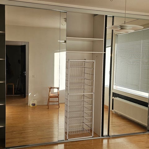 Liukuovikomero 5 ovella.sisältää hyllyt,vaatetangot.2kpl elfan valkoisia säilytysjärjestelmää ja 1kpl paristokäyttöisen valon.pakkausapua paikanpäällä.