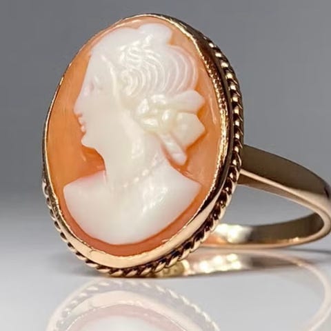 Vintagea? Kyllä. Ylisuuri? Kyllä. Persoonallisuus, joka valloittaa koko huoneen? Ehdottomasti. Tämä cameo-rintaneula on koru, joka rakastaa dramatiikkaa!