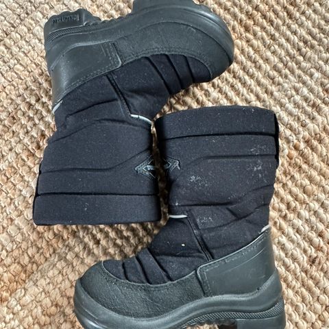 Kuoma lasten talvikengät, koko 24. Väri punainen mustilla vahvikkeilla, unisex-malli. Kengissä on paksu kumipohja karkearakenteisella kuviolla sekä tekstiilipäällinen. Sisäpuoli on vuorattu pehmeällä harmaalla vuorimateriaalilla. Varressa on vetolenkki pukemisen helpottamiseksi. Soveltuu lapsille yleiseen talvikäyttöön ja ulkoiluun.