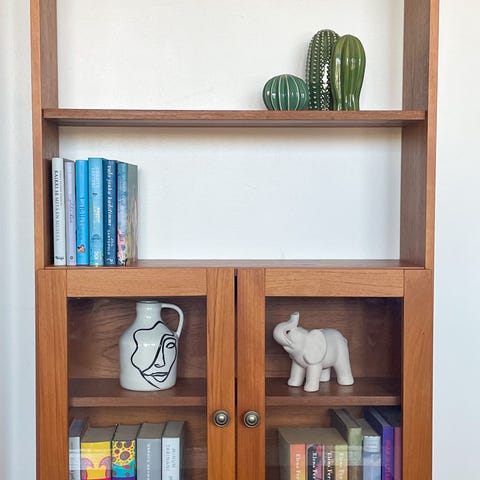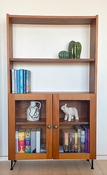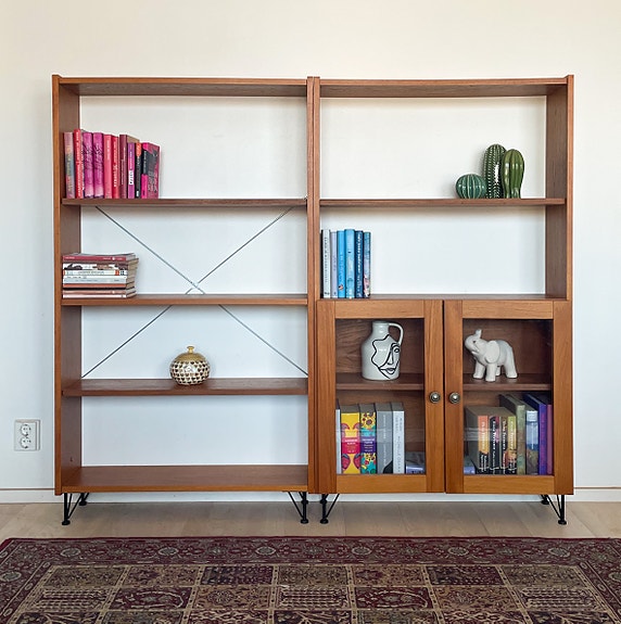 Hyväkuntoinen teak-viilutettu kirjahylly. Pystyy purkamaan osiin. Kuljetus lisämaksusta alueille HKI-Espoo-Vantaa.