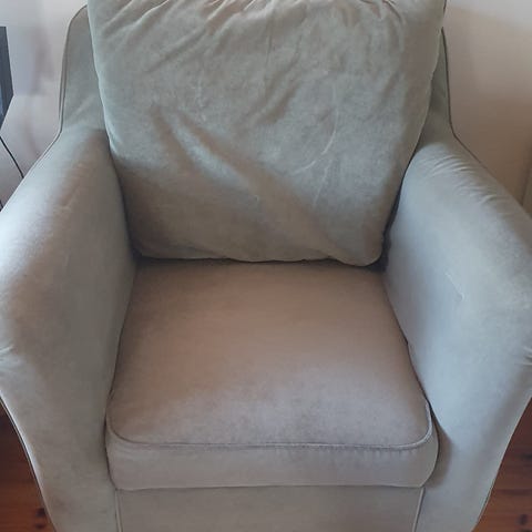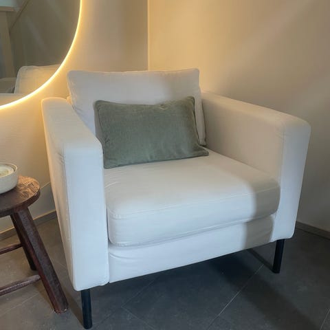 Myydään valkoinen nojatuoli. Olisko ikea. Pestävät pääliset. Hyvä istua.