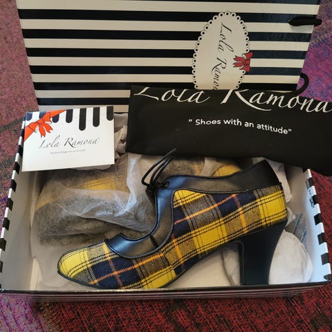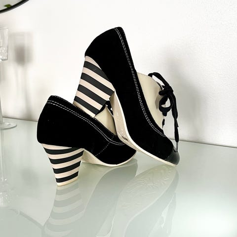 Lola Ramonan uudet ja käyttämättömät Ava korkokengät kokoa 37. Kenkien kärjissä kiiltävät yksityiskohdat sekä Lola Ramonan tunnuksenomainen, hieno raidallinen pohjakuviointi. Kenkien mukana saat korkolaput, kuosin mukaisen säilytyslaatikon sekä kankaisen Lola Ramonan säilytyspussin kenkien säilytykseen.