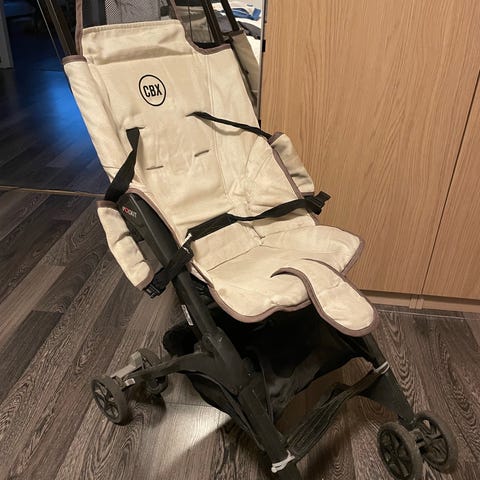 Kinderkraft lastenrattaat hiekanruskealla kankaalla ja mustalla rungolla. Rattaissa on istuinosa viisipistevöillä ja säädettävä selkänoja. Toinen olkainpehmuste hävinnyt!! Suuret takapyörät ja pienemmät kääntyvät etupyörät. Selkänojan saa makuuasentoon.