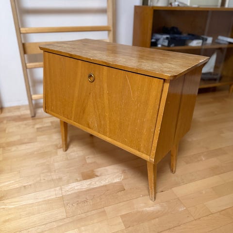 Ehkä 50-luvun funkkistyylinen senkki jossa loimukoivupintaa. Pientä laittoa kaipaa, mutta osaaville käsille se ei ole mikään ongelma! Klaffitason toinen käsivarsi kateissa, toisen oven avaimenympärys rikki. Pinnassa kosteusvauriota, näkyy kuvissa.