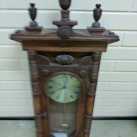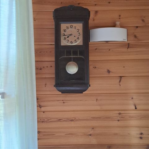 Puusepän käsityönä tekemä kello. Koneisto vaatii huoltoa.