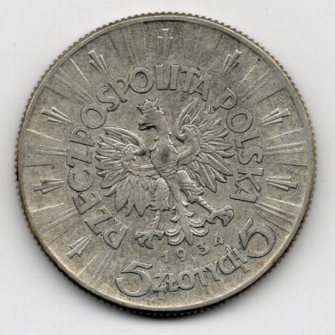 Puolan 5 Zlotya 1934 kuvan kunnossa. 11,0g 750/1000 hopeaa.